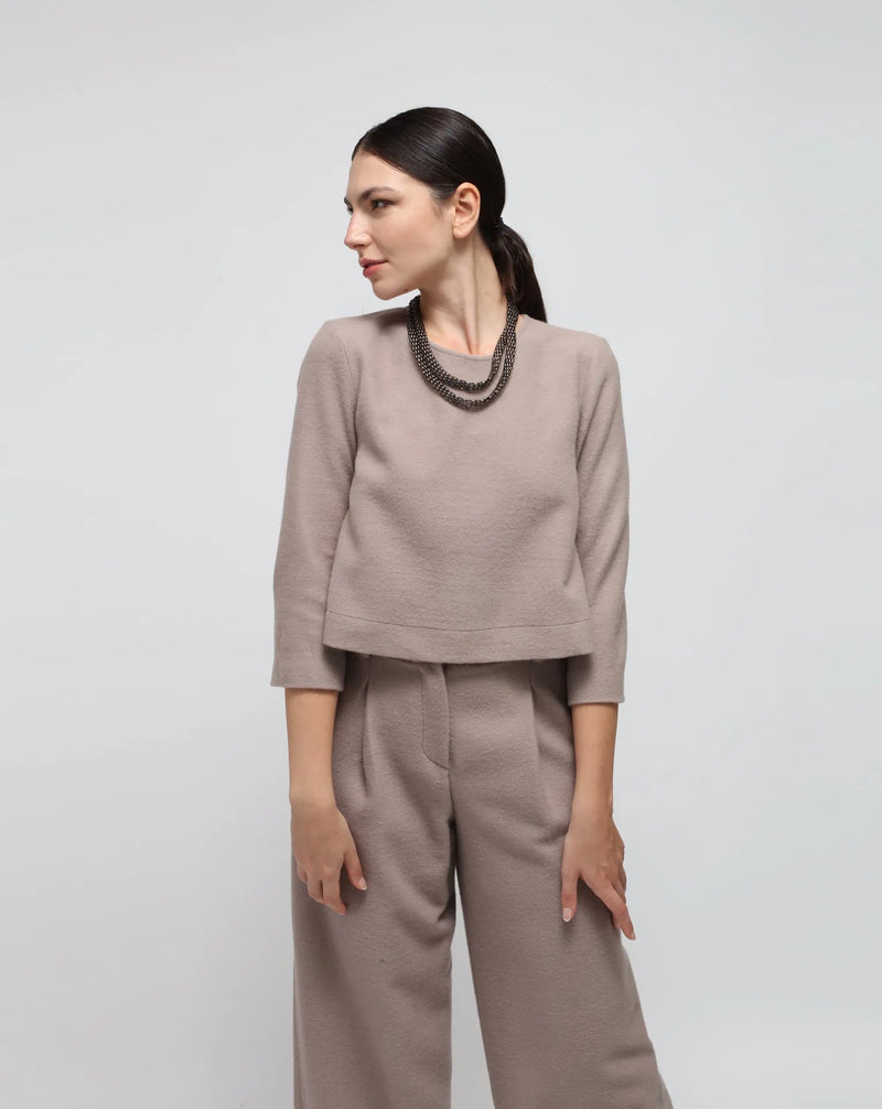 Gemacht für jeden Tag. Dieses graue Woll-Top mit Rundhals hat eine leicht ausgestellte Form, 3/4-Ärmel und Knöpfe am Rücken—kleine Details, die es besonders machen und trotzdem super easy tragbar bleiben.