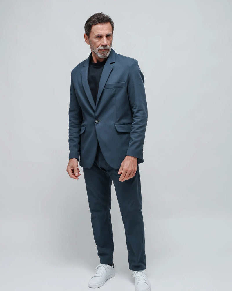 The combination of the blue one-button jacket and the straight pants creates a suit that is incredibly versatile to bring with you wherever you go. The Gabardine cotton fabric is soft and cool for the summer. Wear it at work and in the evening. Or combine each element with another piece. Enjoy it...