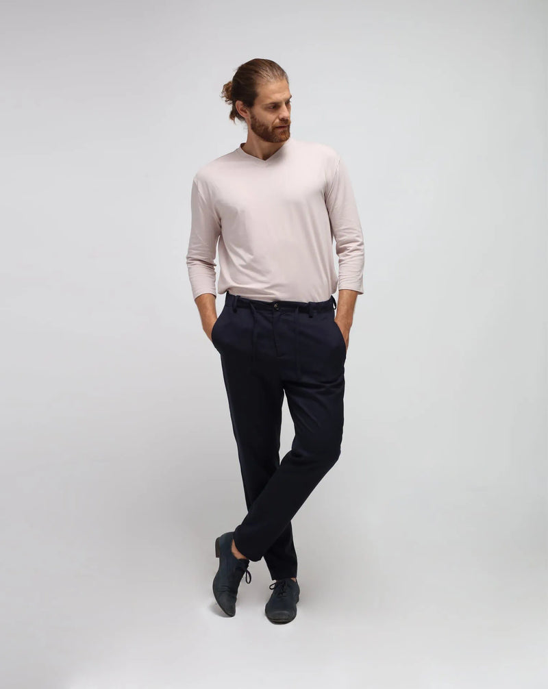 The blue traveller pants are the most comfortable pants you will ever wear. They represent a twist on a classic cut with the dropped crotch and the drawstring which add a casual look so that elegance is combined with comfort. These pants can be worn in any occasion from a creative presentation to a dinner party. Try to travel wearing them for hours on a plane and you will see what we mean by comfortable pants and why we called them traveller pants. The blue fabric is 50% Cotton and 50% Cupro which makes it so soft to the touch. These pants will be your trusted companion for any occasion this season. Combine them with the double-breasted jacket to create a full suit. Like everything else from H&L it is a limited edition pants with only 5 that can be made with this fabric. Love these. Wherever you go.