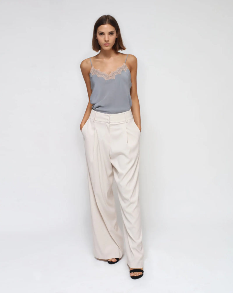 These Palazzo white, pleated pants with front pockets and high waist are incredibly versatile and to be worn in any occasion. Pants for fun, pants for work. Combine it with what you like or as a Tailleur with our One-Button Jacket.
