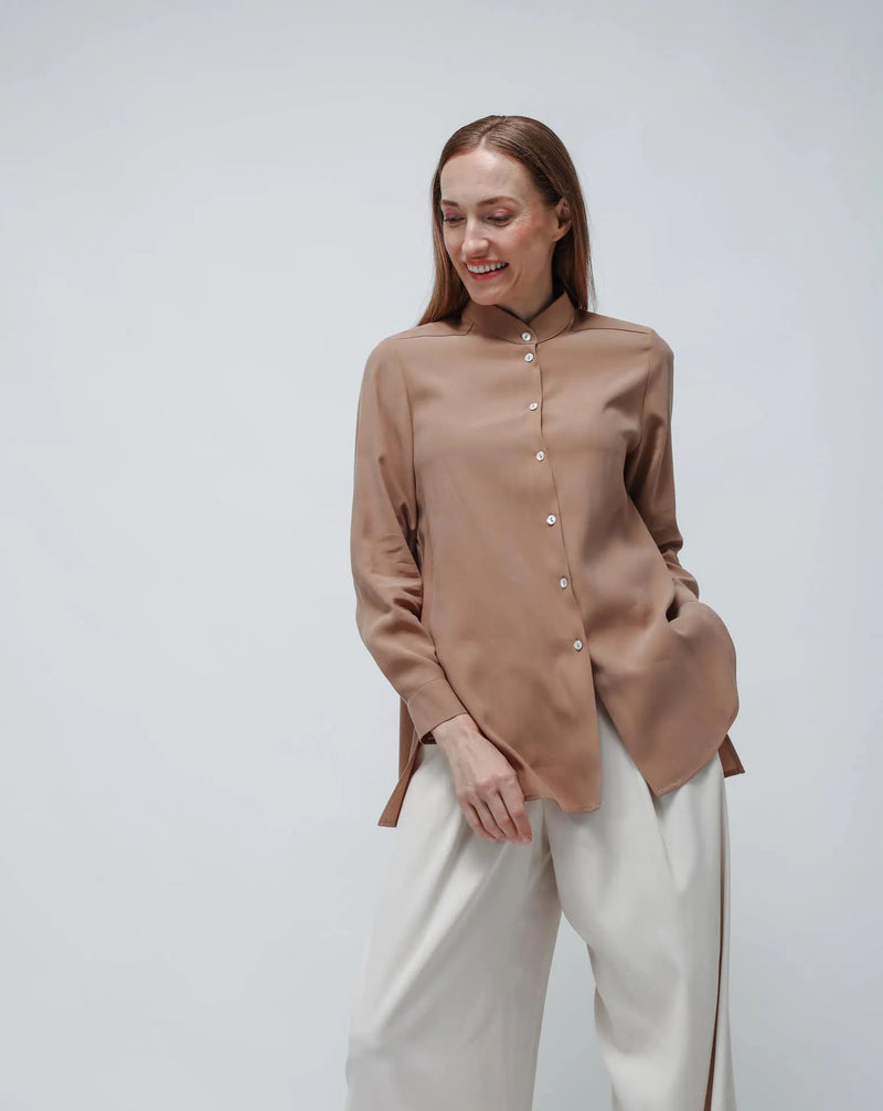 Camicia coreana lunga beige in cupro