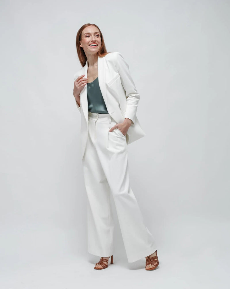 Per un completo coordinato, abbinala ai nostri pantaloni palazzo bianchi in Punto Milano e indossala come tailleur.