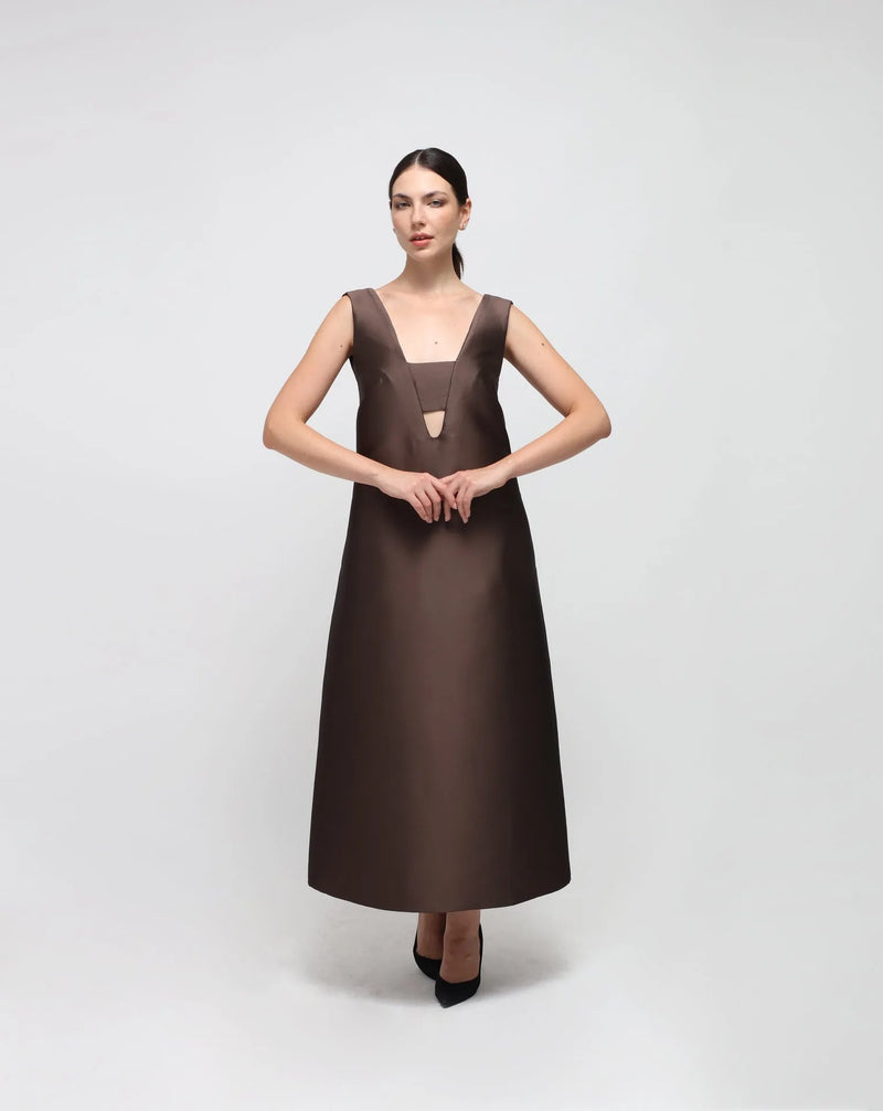 Inspired by the Great Rift of Ethiopia, the Kara Dress is an ankle-length, flared evening dress designed to move with you.