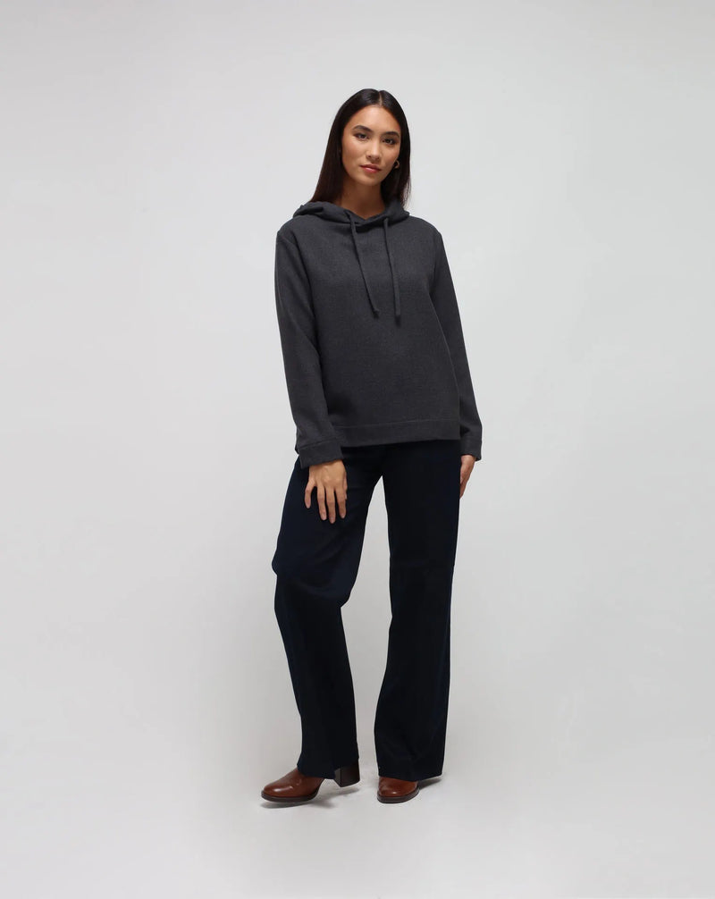 A woman wearing a gray mixed cashmere hoodie and dark pants, standing against a plain background.