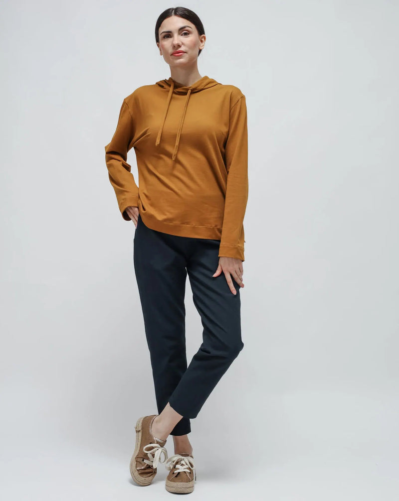 A woman standing in white backgroun wearing an okra mustard hoodie and blue pants.