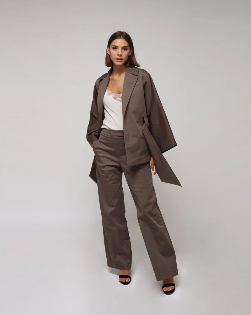 Inspired by the old Kimono tradition from Japan, this taupe, wide-fit jacket wraps around you thanks to the big belt. The large sleeves provide elegance that is unlike any other. Great for any occasion, from the office to an evening party. Bring it with you anywhere you go this fall season. You can wear it with what you like it or combine it as a Tailleur with our The Pants and get 10% off the two.